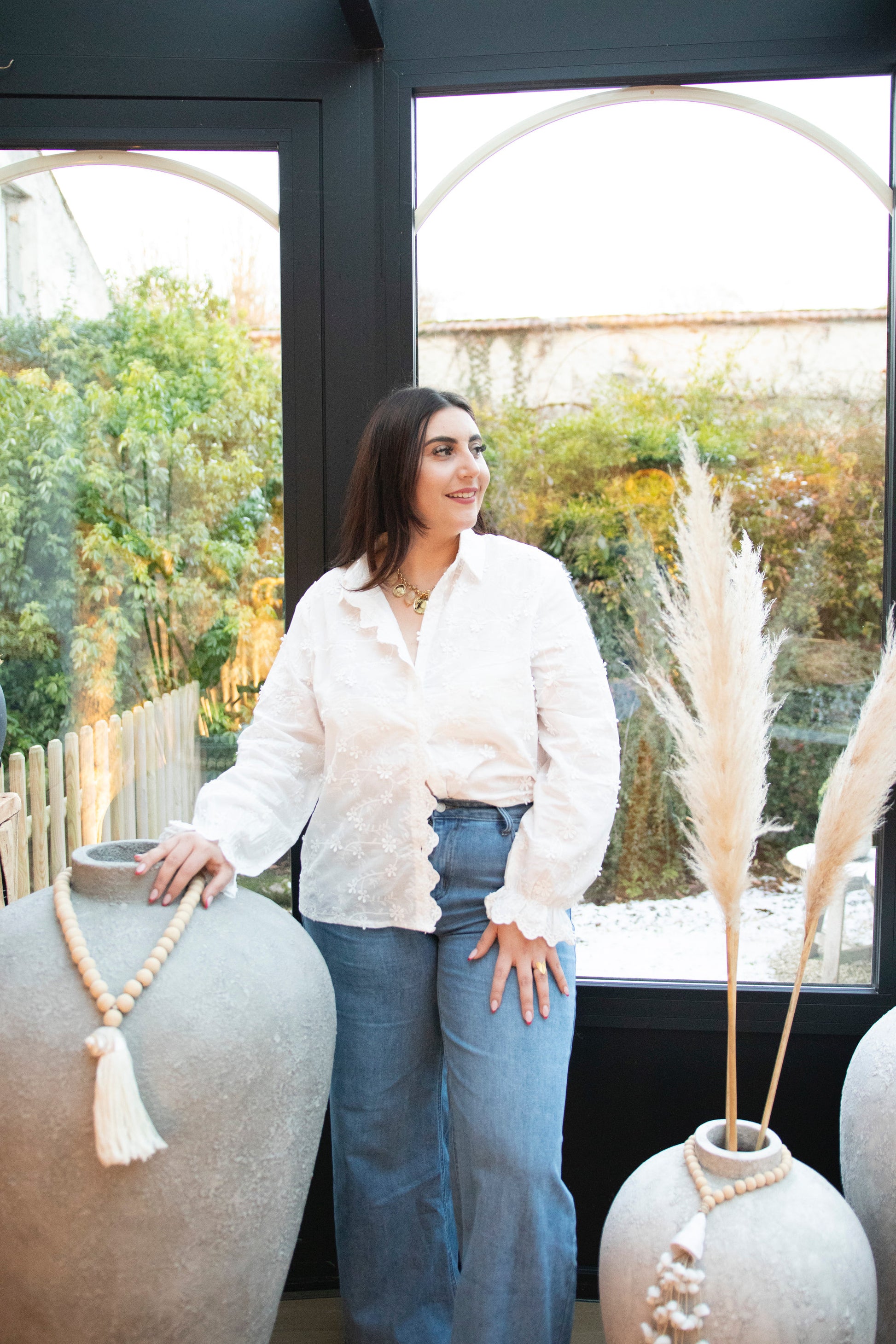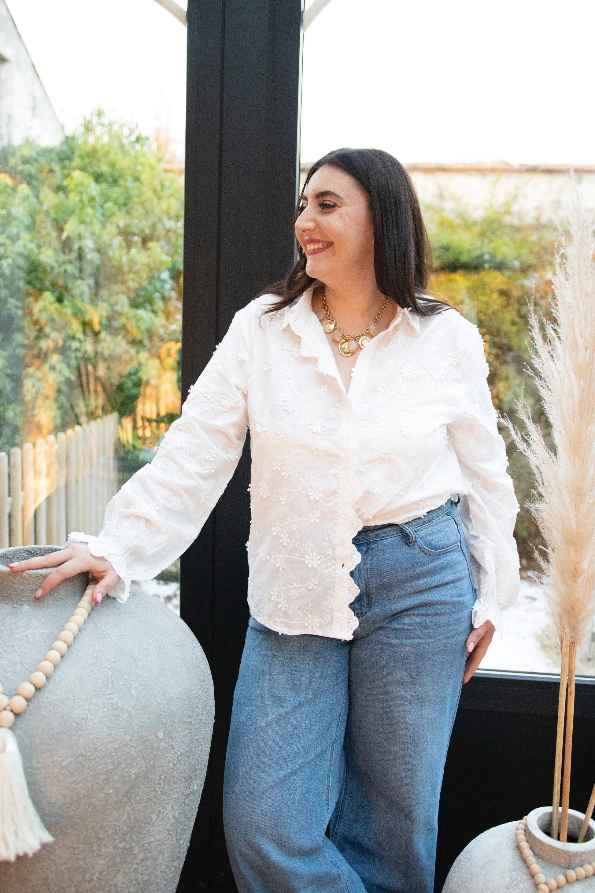 Chemisier confectionné en coton de qualité supérieure, orné de broderie anglaise délicate.