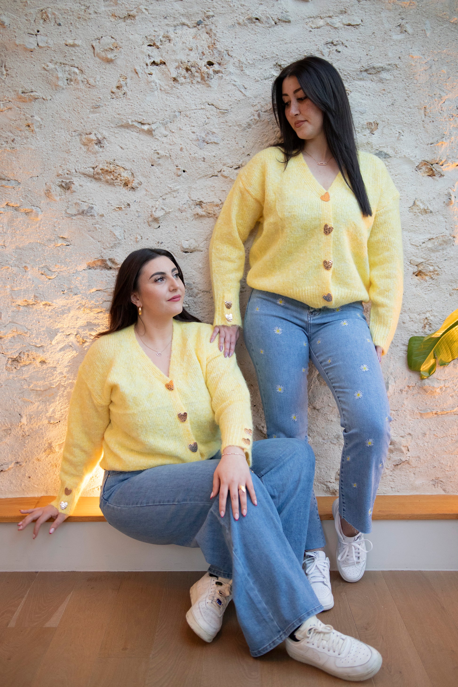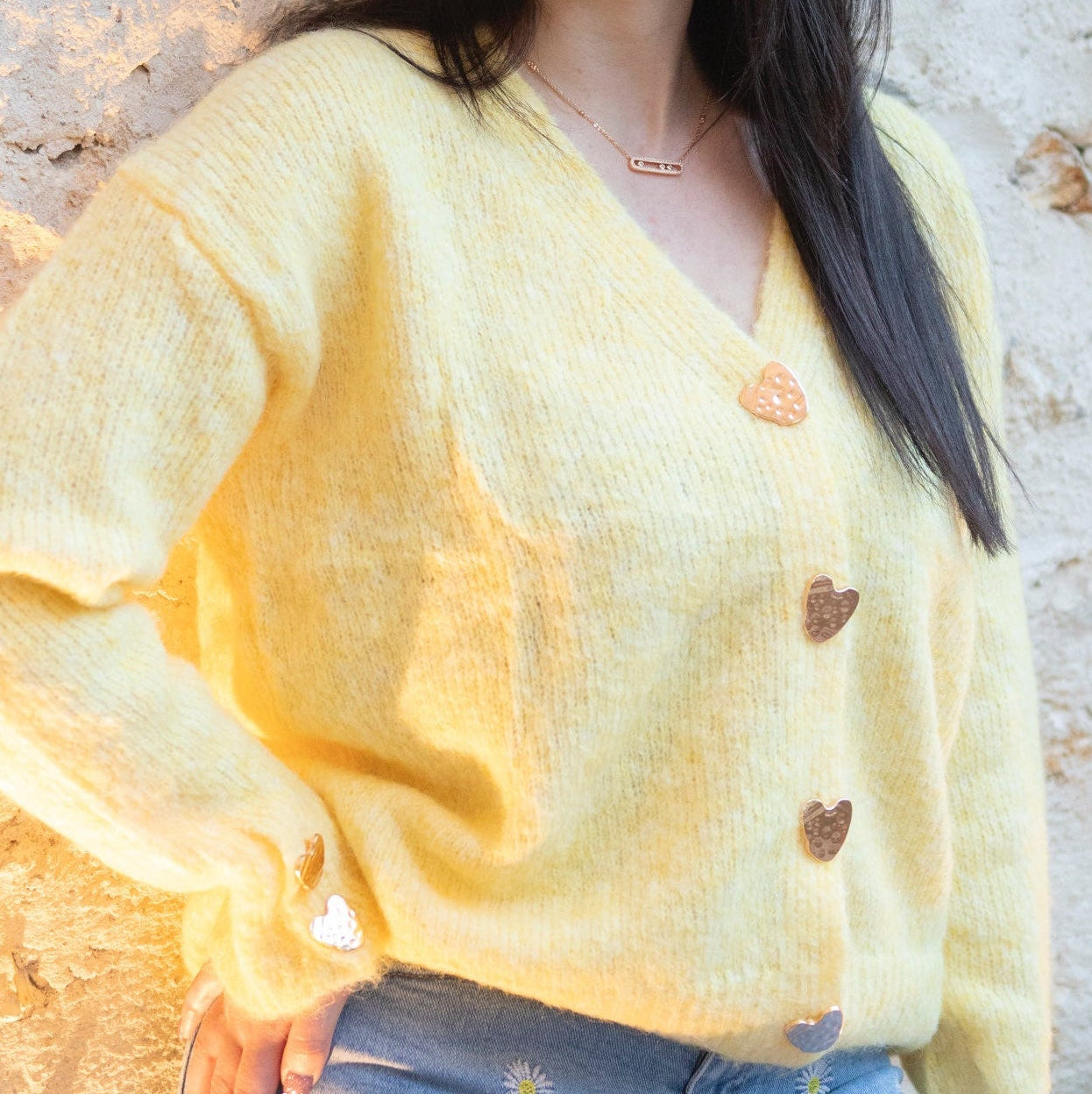 Gilet jaune tout doux en TU aux finitions délicates, agrémenté de boutons en forme de cœur.