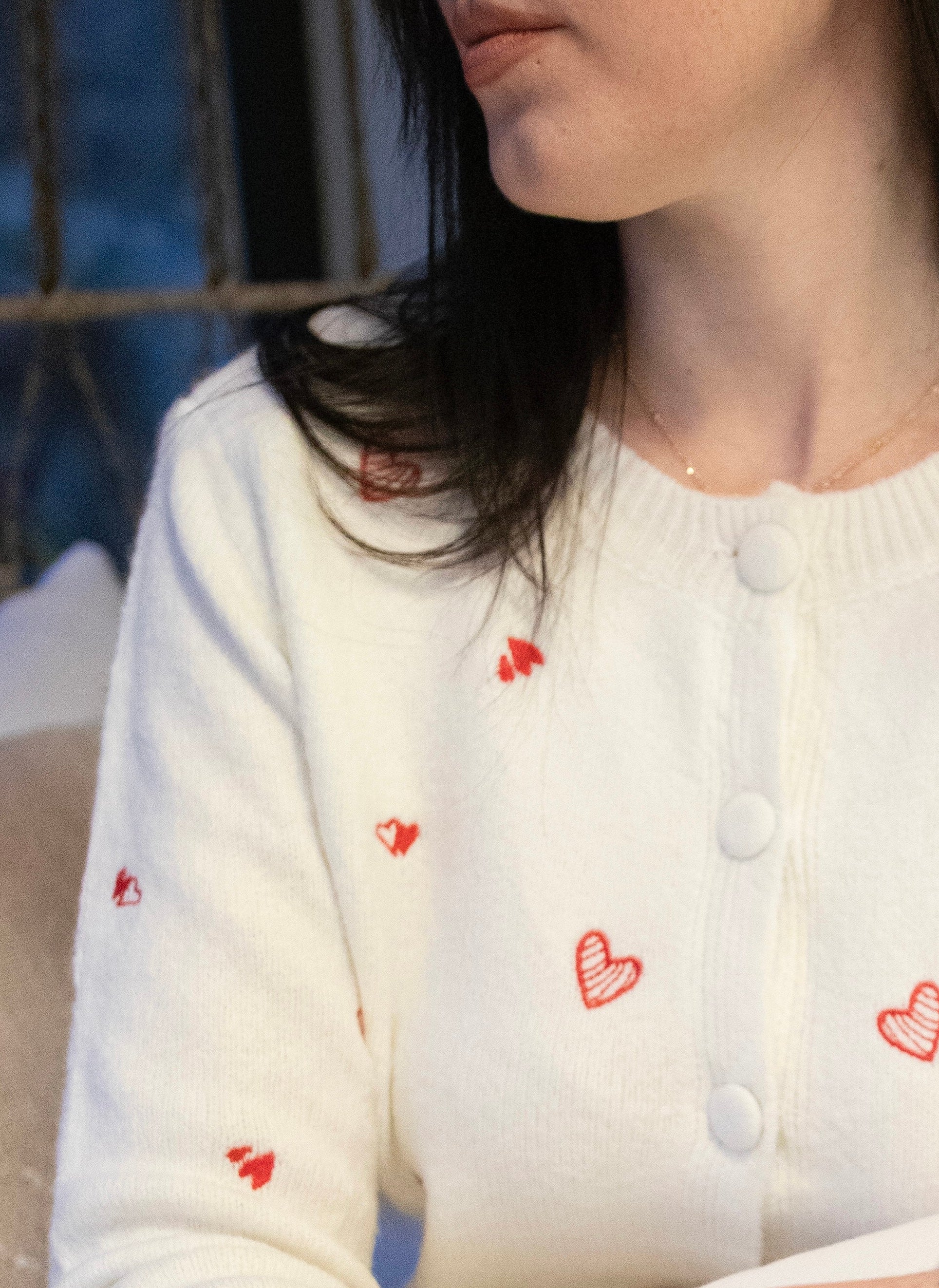 Découvrez ce gilet douillet avec des motifs cœur délicats, avec sa matière agréable au toucher.
